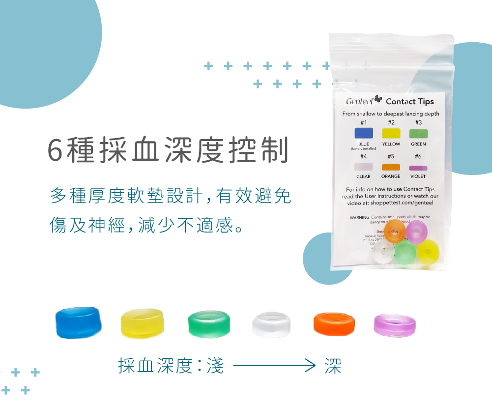使用前需確認採血針粗細與更換適合深度的軟套。